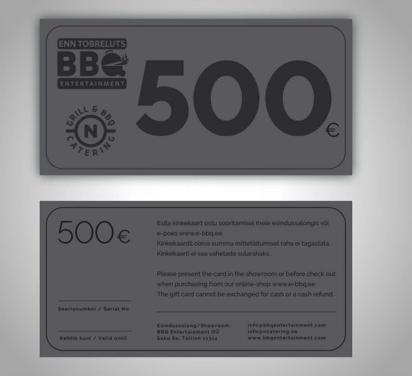 • Esita kinkekaart ostu sooritamisel meie esindussalongis või e-poes www.e-bbq.ee. Kinkekaardil oleva summa mittetäitumisel raha ei tagastata. Kinkekaarti ei saa vahetada sularahaks. Kinkekaardid on saadaval ka digitaalsena.