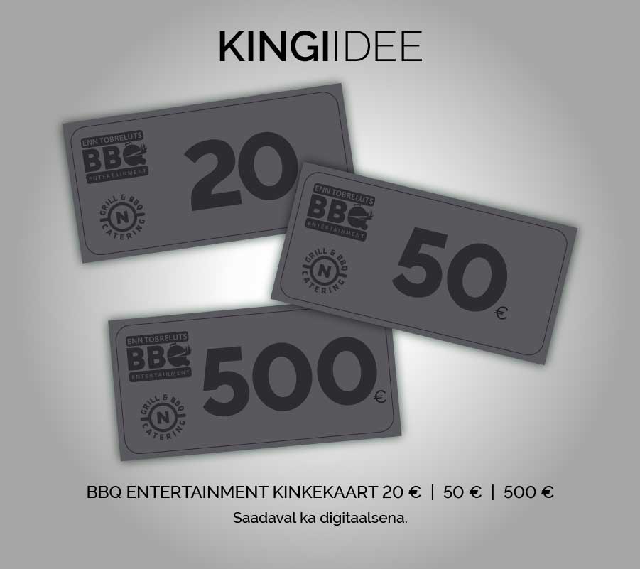 - Kinkekaardid kehtivad nii veebipoest või meie esindussalongist kauba ostmisel (sh Kamado Joe grillahjud) ja ka BBQ Entertainment OÜ cateringiteenuste eest tasumisel.