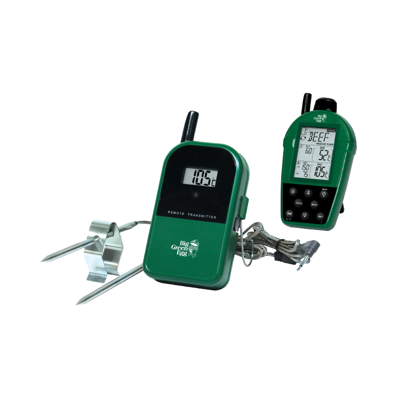 Teadmised on jõud! Kahe anduriga juhtmeta termomeeter mõõdab kraadise täpsusega su toiduainete sisetemperatuuri ja ka su Big Green Eggi sisetemperatuuri. Sellel termomeetril on kaks andurit ja vastuvõtjaga pult, mille saad käepärast hoida. Kui soovitud temperatuur on saavutatud, annab pult sulle sellest automaatselt märku (kuni 91 meetri kauguselt)