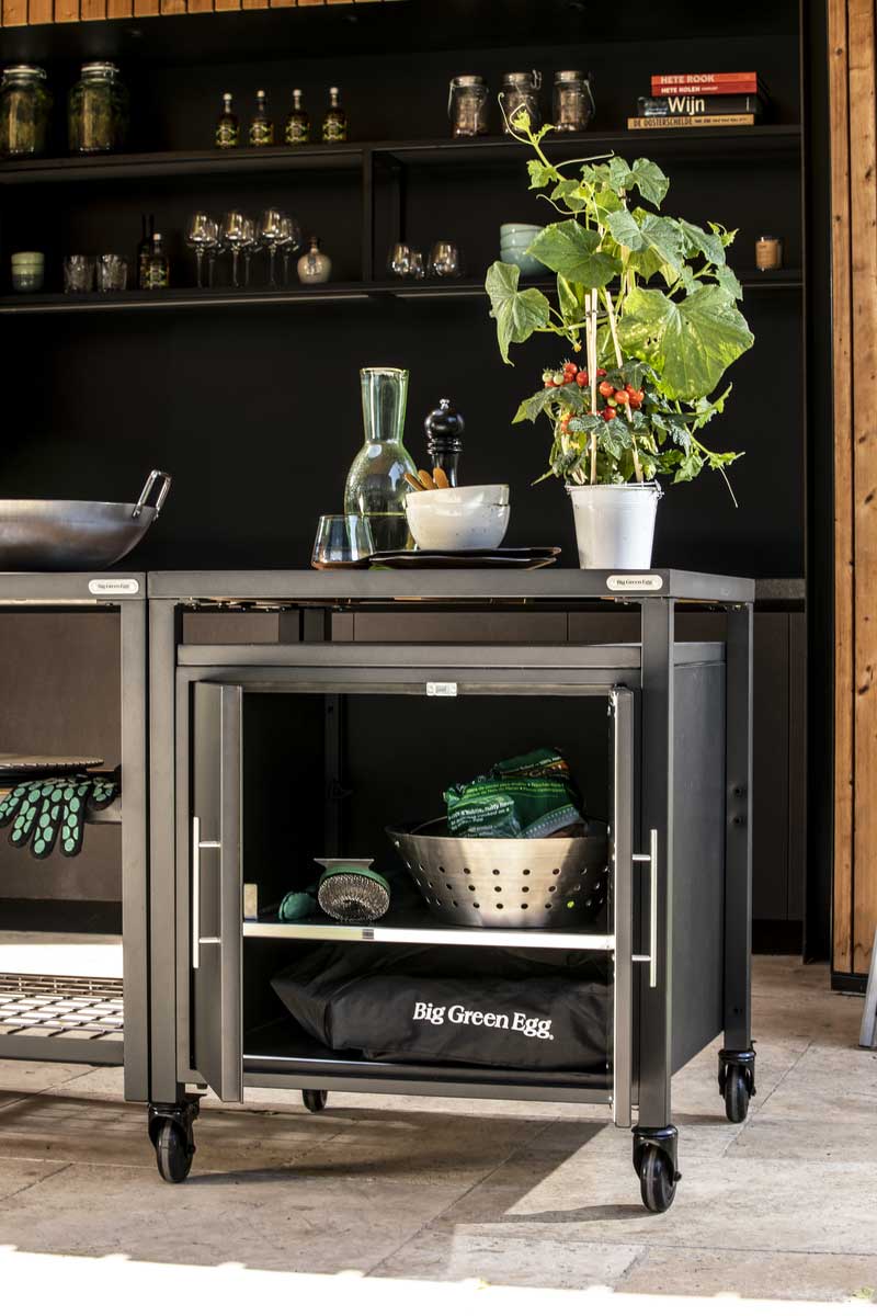 Kus sa peaksid hoidma kõiki neid hädavajalikke Big Green Eggi tarvikuid? Loomulikult uues lisakapis. Selles saad hoida isegi sütt, sest tugeva kapi sisu on veekindel. Nagu võid juba Big Green Eggi puhul oodata on sellel lõputult värvide ja materjalide valikuvõimalusi. Näiteks võid valida roostevabast terasest või akaatsiapuidust riiuliplaadi. Lisakapp on tehtud pulbervärvitud alumiiniumist ja terasest, mis on kerge, vastupidav ja ei vaja hooldust. Lisakapil on reguleeritavad jalad.