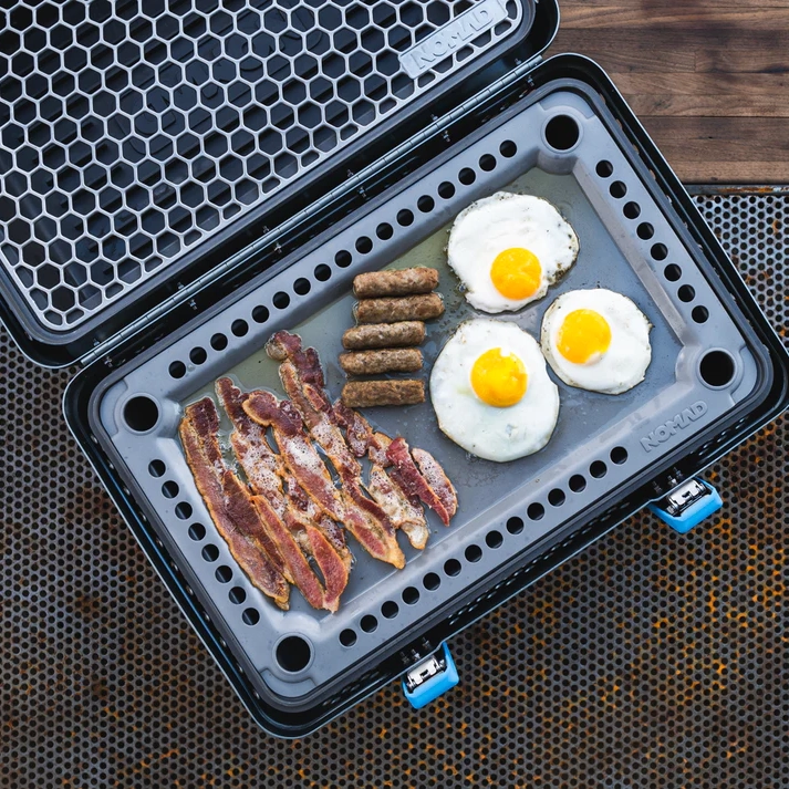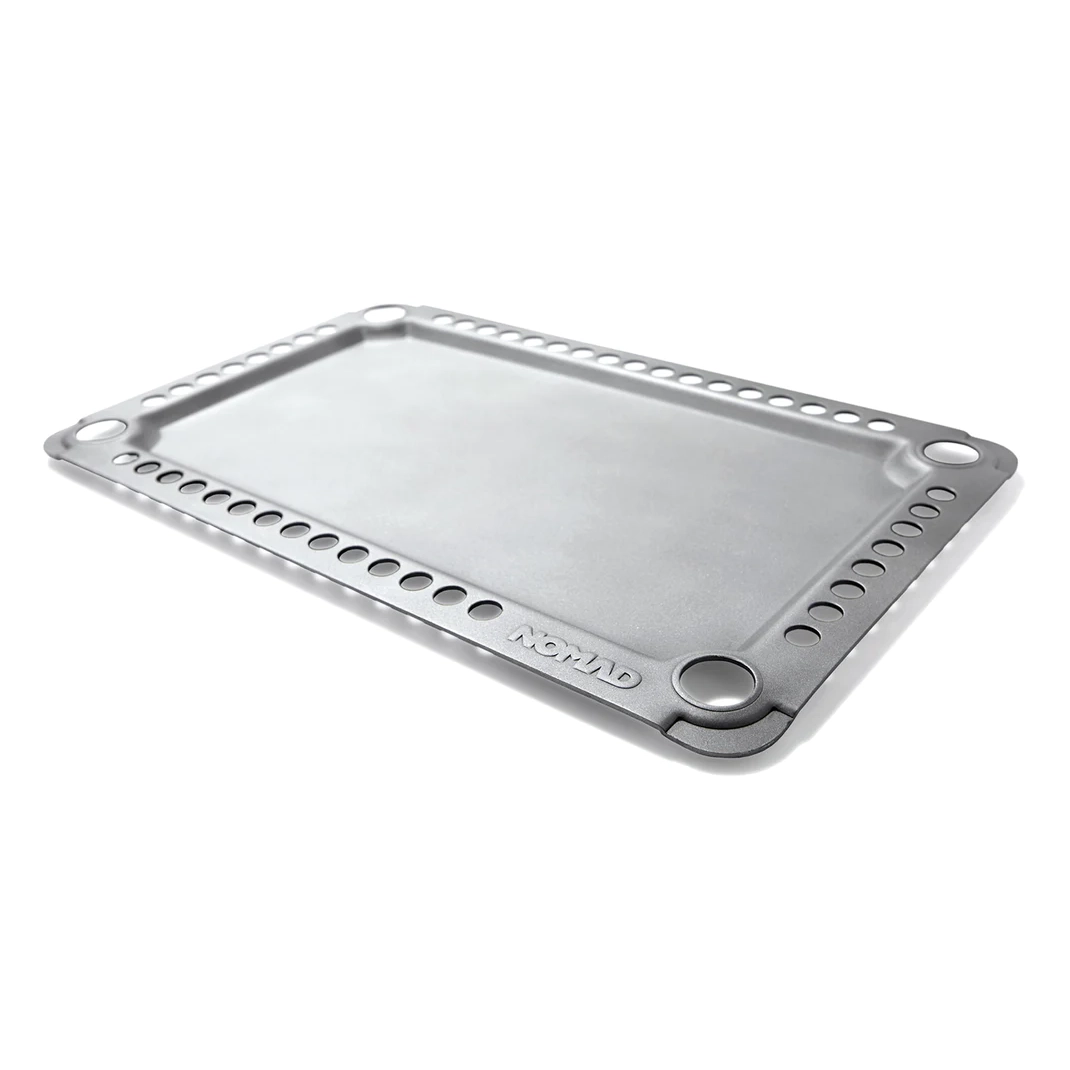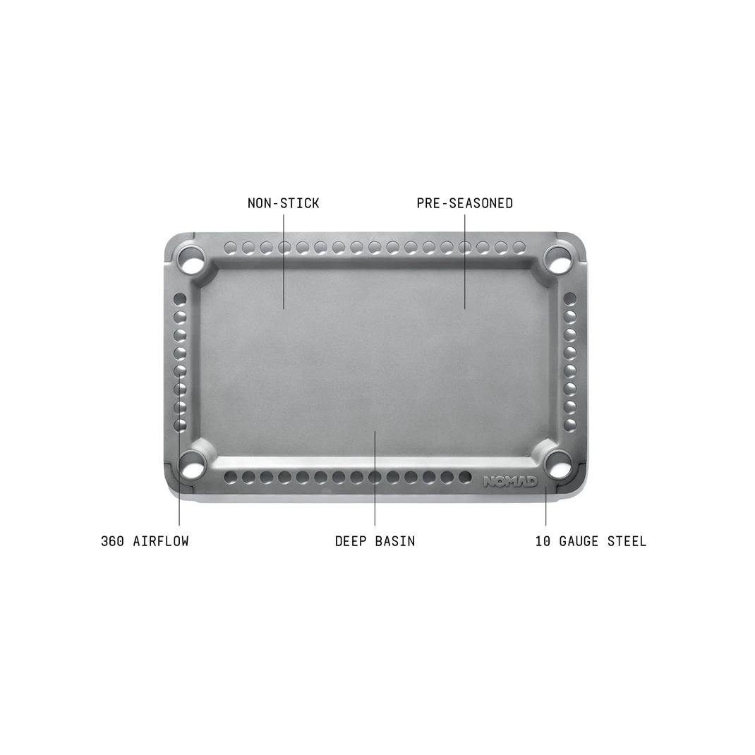 Valmistatud paksust, külma veeretatud süsinikterasest, NOMADi uus grillplaat on ehitatud taluma kuumust. Eelnevalt köögiviljaõliga maitsestatud ja kohe kasutusvalmis, püsib see mitmekülgne tööriist loomulikult kleepumatu kuni 1200ºF. Tõstetud ja perforeeritud ääris 360° õhuvoolu jaoks jäik, 10 mõõduga teras (0.135″ paksus) ühtlaseks kuumuse säilitamiseks. Täpselt lõigatud sobimaks sinu NOMAD grilliga. Suurepärane grillil, pliidil või avatud leegi kohal küpsetamiseks. Tehnilised näitajad: kaal: 5 naela, mõõtmed: 18.5″ x 11.5″. Lisab 212+ ruuttolli grillimispinda! Kõrgetemperatuuriline magnetiline lukustus – võib hoiustada suletud grillis koos resti või teise grillplaadiga.
