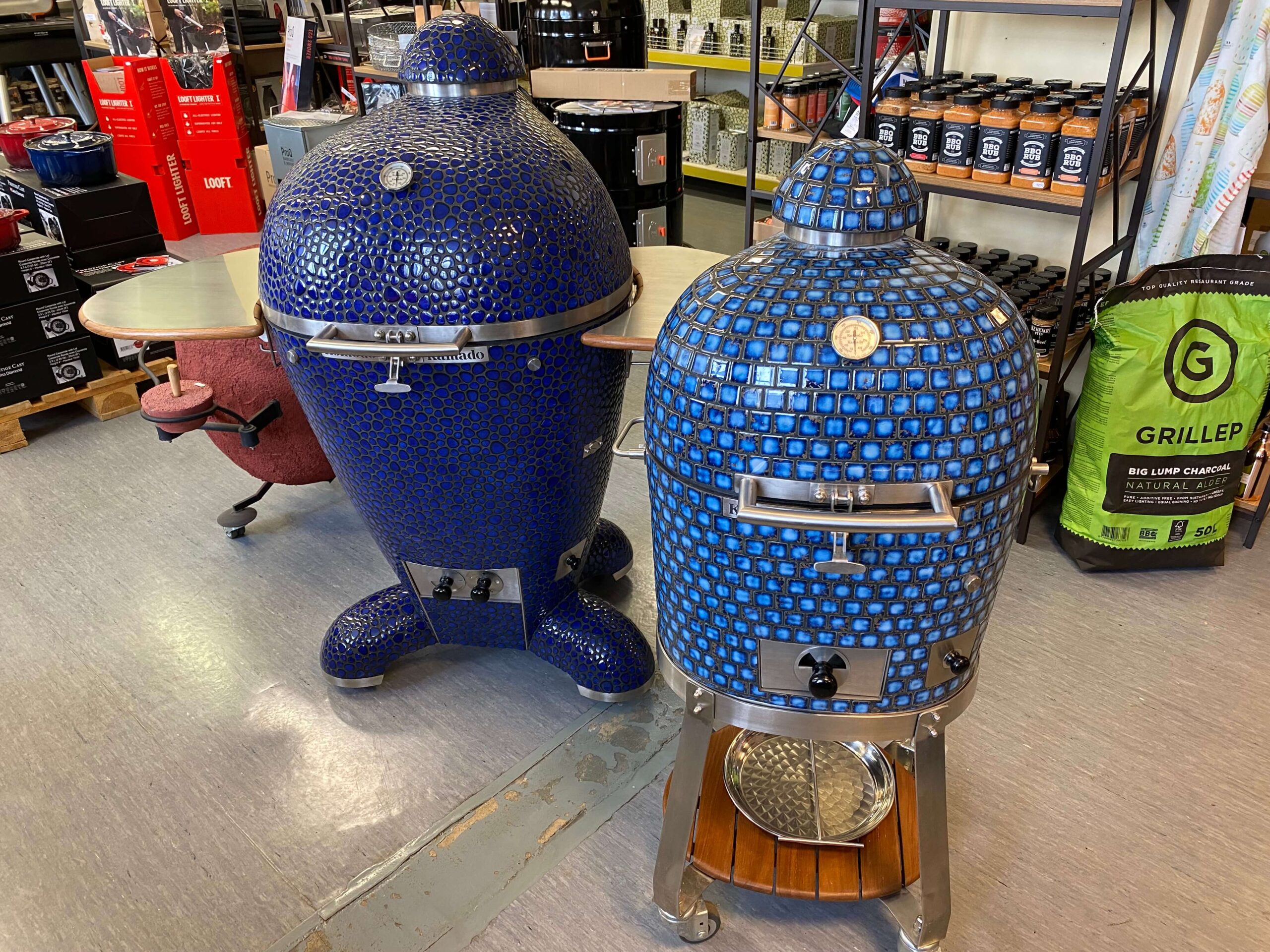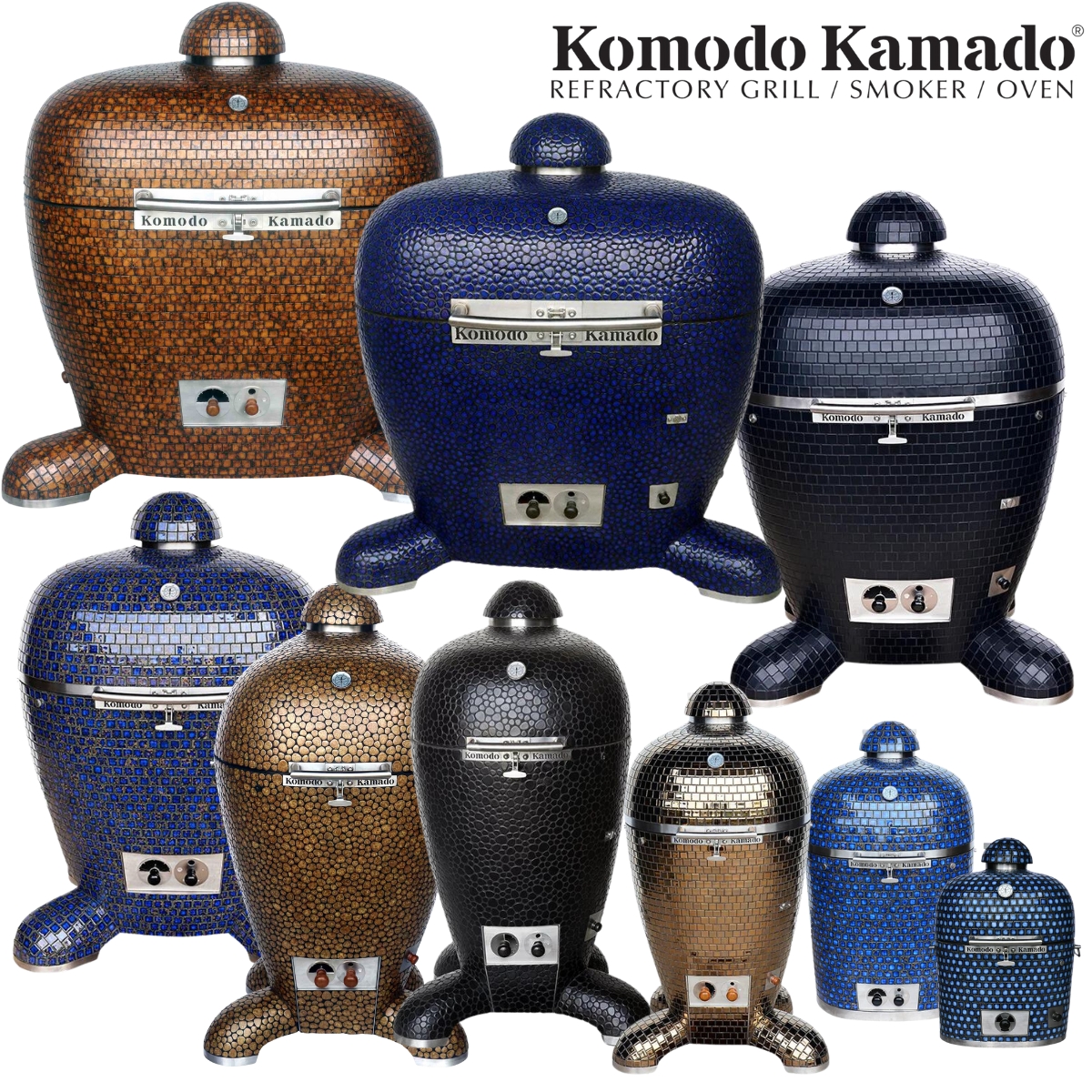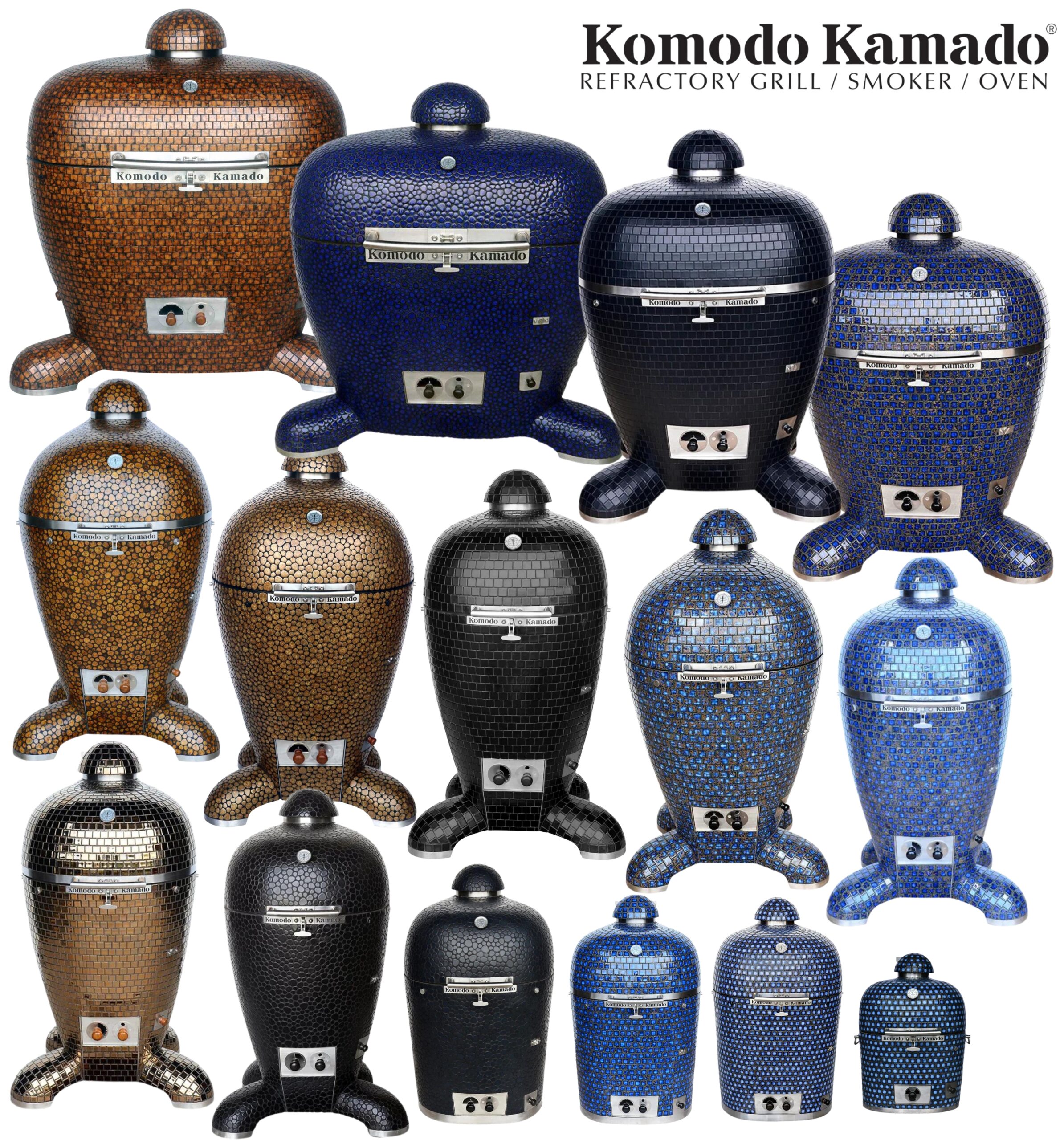 • KOMODO KAMADO grillahjusid on võimalik eritellimusena tellida väga laia mosaiikplaatide värvi- ja kujuvalikus, ahju tüübi osas ja ka suuruses (ahju kaalud ca 125 kuni 800 kg, grillresti läbimõõt 16” st 40,64 cm kuni 42” st 107 cm). Oma soovist anna teada või +3725165581 Enn Tobreluts.
