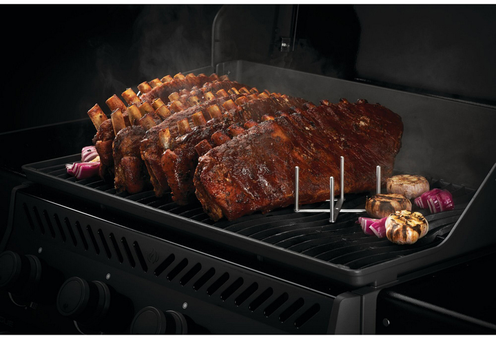 Napoleoni roostevabast terasest ribihoidja on mõeldud kuni kuue ribirea küpsetamiseks korraga. Reguleeritava laiusega konstruktsioon võimaldab hoidjat kohandada vastavalt grilli suurusele ja ribide kogusele.