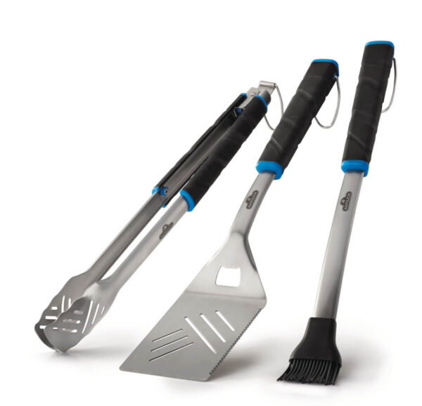 See praktiline grillimistarvikute komplekt sisaldab tange, spaatlit ja silikoonpintslit, mis muudavad grillimise mugavamaks ja tõhusamaks. Tangidel on lukustusmehhanism, mis teeb hoiustamise lihtsaks ja ruumisäästlikuks. Spaatlil on sisseehitatud pudeliavaja – hea võimalus avada jook ilma eraldi tööriista otsimata.