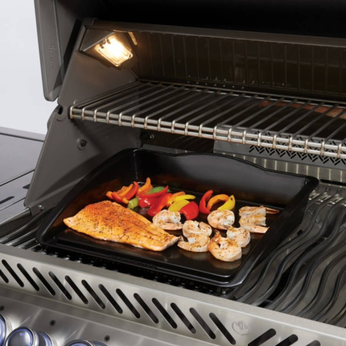 Pruunista oma lemmiktoit kuumal malmist Plancha küpsetuspinnal! Plancha praepind on ideaalne kiireks ja ühtlaseks grillimiseks. Läikiv portselaniga kaetud malm tagab mittekleepuva pinna, mis muudab selle puhastamise hõlpsaks. Tervise mõttes on see toode loodud nii, et toidust eralduv rasv valgub pinnalt esiservani, servades samal ajal takistades rasva sattumist grillile, vältides rasvapõletusi. Mõõdud 30×37cm esiserv. Sobib Napoleon Roque 425/525/625, samuti Prestige’i mudelitele.