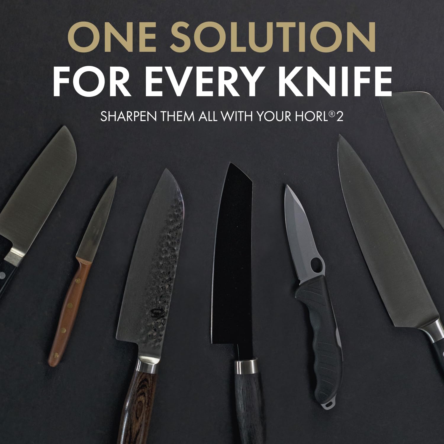 HORL2 on vahetatavate abrasiivketastega teritusseade, mille magnetiline nurgahoidik fikseerib noa kas 15° (peen lõikeserv) või 20° (tugevam serv) alla. Teritamine toimub teemant- ja keraamilise kettaga: tööstuslikud teemandid vormivad tera, keraamiline ketas silub ja viimistleb. Seade sobib Euroopa kööginugadele, süsinik- ja roostevabadele terastele ning välinoadele. 15° nurk on täpistööks (nt sushi, sashimi, damaskterad), 20° igapäevaseks ja vastupidavamaks lõikeservaks.