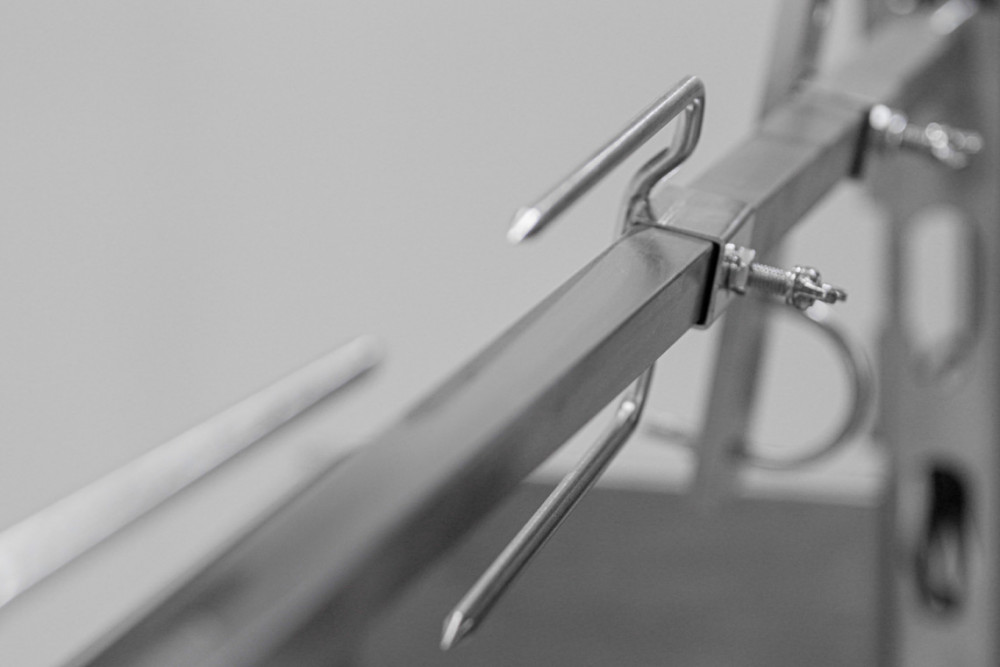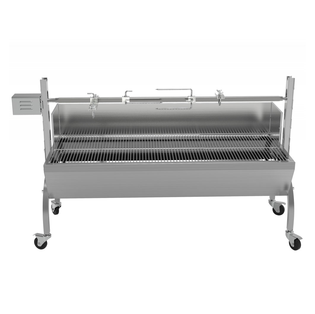 Grill on valmistatud 304 kvaliteediga roostevabast terasest, mis tagab selle vastupidavuse rannikualadele omasele kliimale. Grill on varustatud aluse ja nelja robustse rattaga, mistõttu on seda suurt grilli lihtne transportida. Speti pöörlemiskiirus on umbes 3 pööret minutis, mis tagab toidu ühtlase küpsemise.