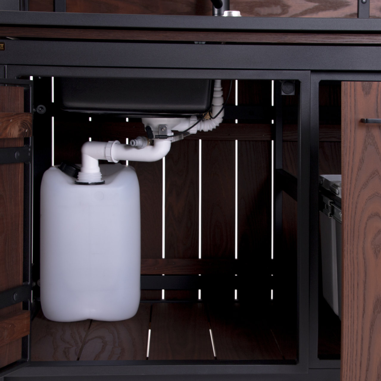 Väliköök on varustatud valamu ja segistiga, mis on kergelt ühendatav kasvõi aiavoolikuga. Kraanikausi alumises kapis kergesti lahtiühendatav ja tühjendatav 20l anum. Söögitarvikute hoiustamiseks on 3 mahukat sahtlit.