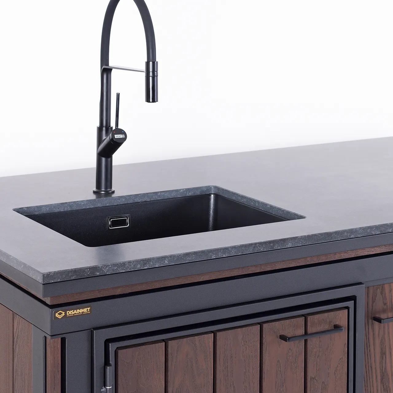 Terrassile sobiliku töölaua JANE töötasapinnaks on 20mm paksune looduslik graniit NERO ASSOLUTO. Graniidist töötasapind on suurepärane valik olles kuumakindel (talub üle 200 kraadi Celsiust), plekikindel (lihtne puhastada) ja vähepoorne (poorsus 0,0 – 0,2%), mis tähendab, et töötasapind vastab ka kõige rangematele hügieeninõuetele. Sobilik otseseks kontaktiks toiduga.